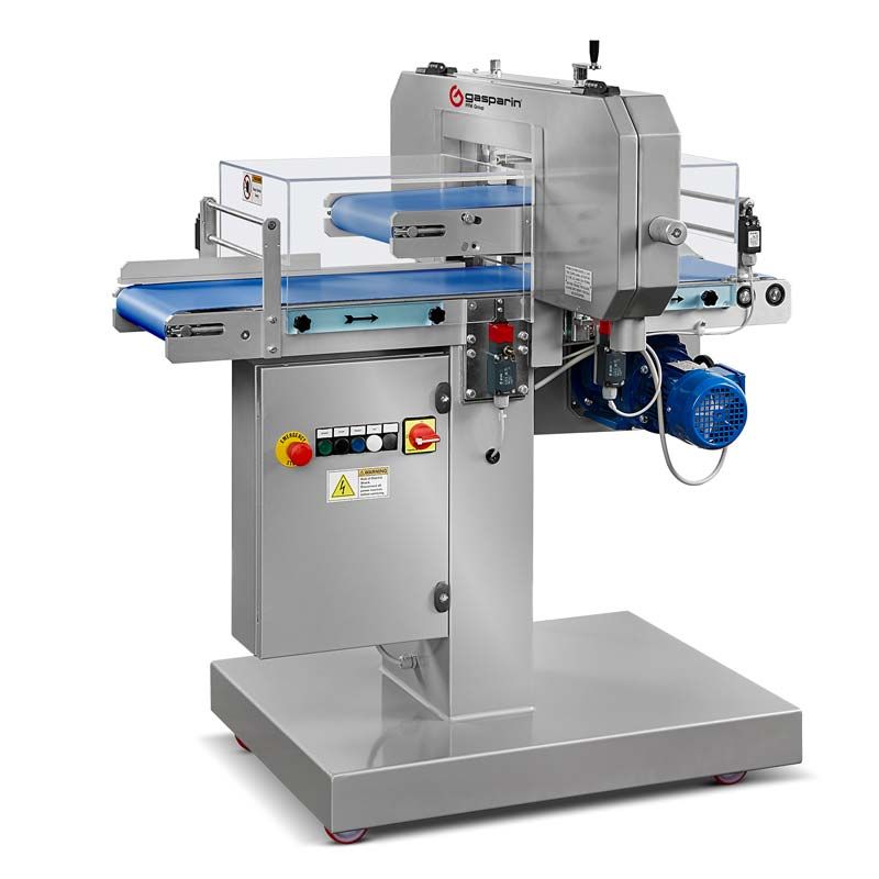 • Inlet and outlet loading conveyor belts; upper belt with adjustable height designed to accompany the product towards the blade and lower belt with lateral guide